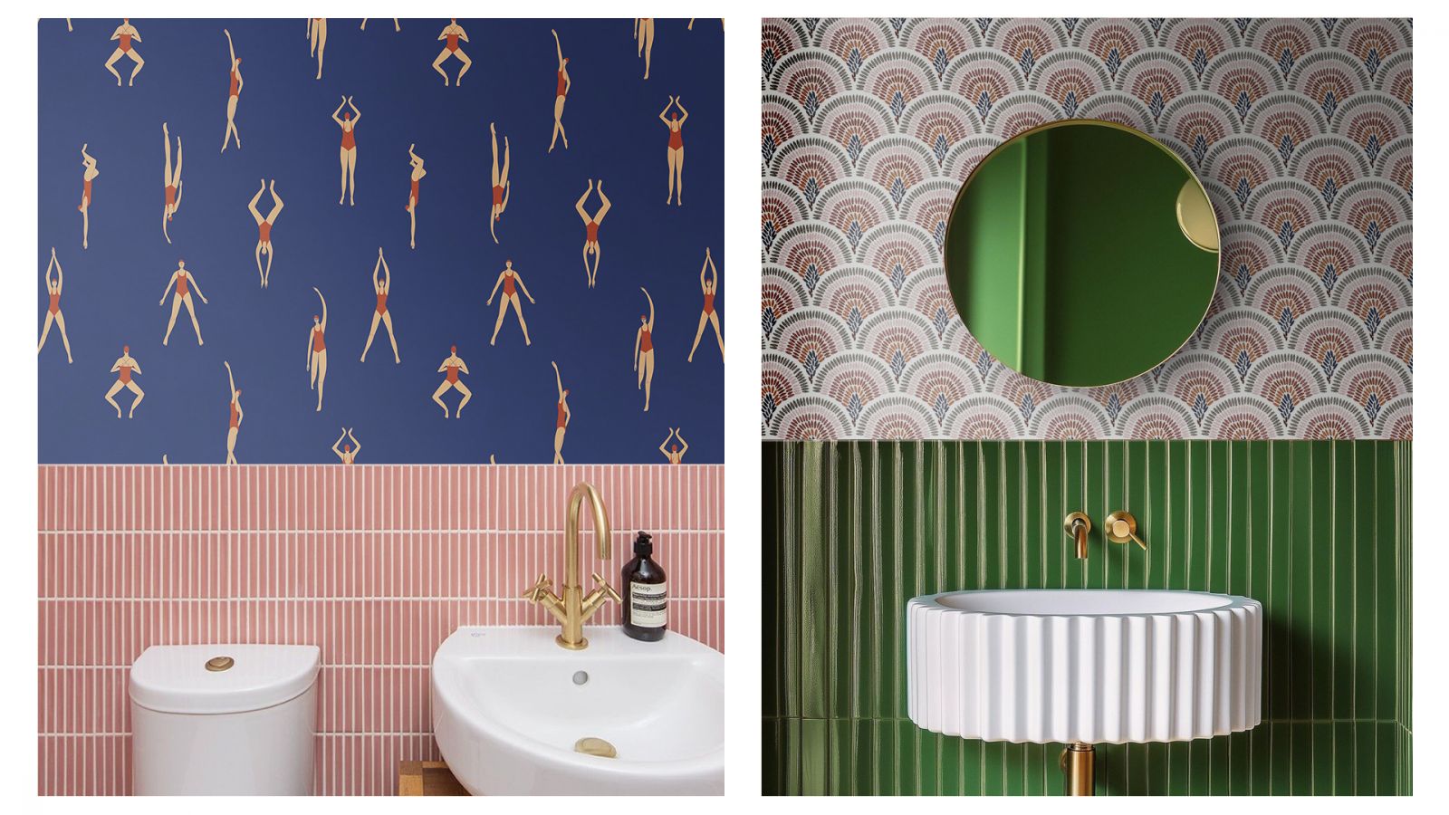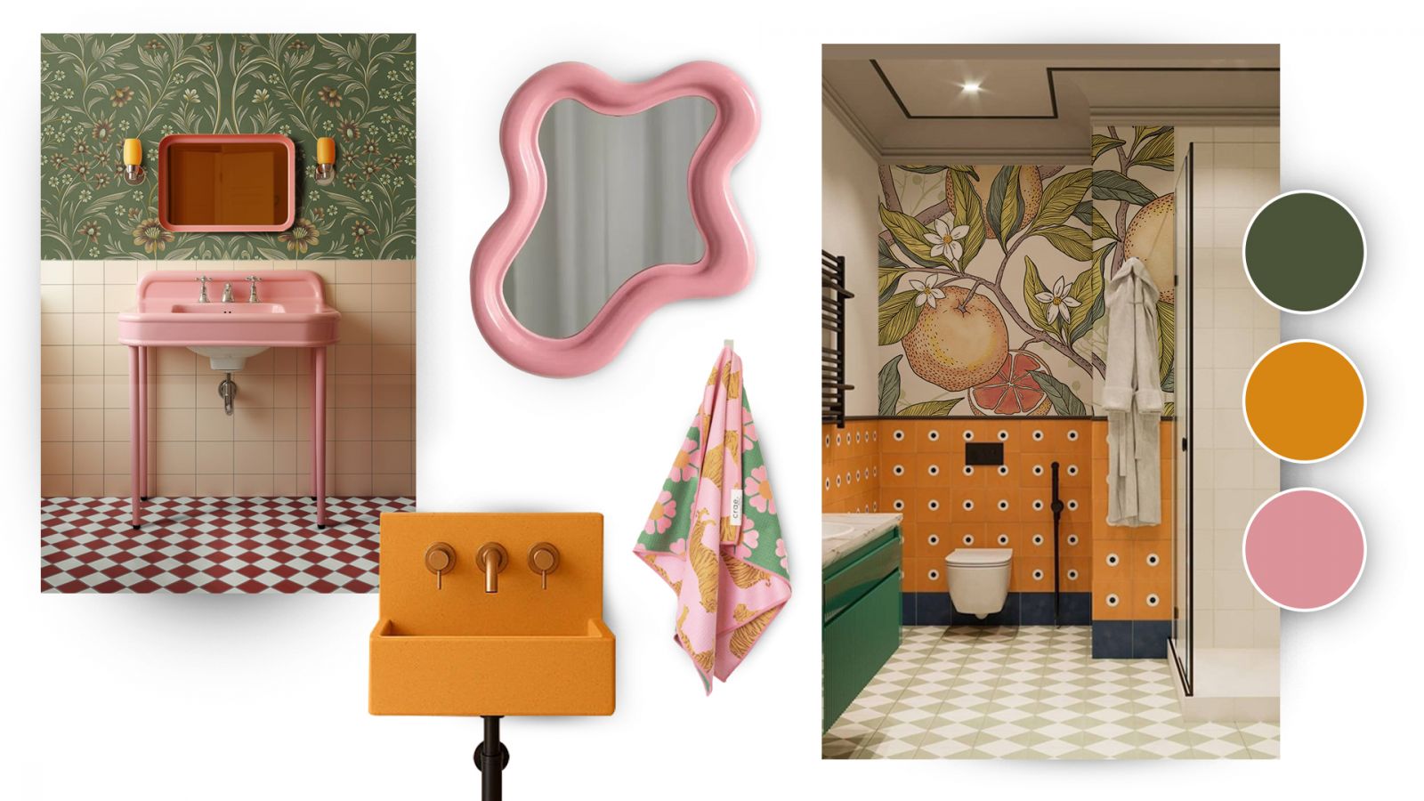 Ванная и санузел в стиле китч – такое тоже возможно. Это настоящее воплощение протеста и иронии. В качестве отделочного материала для пола и стен чаще всего используется плитка. А вот какой она может быть – бесконечный калейдоскоп геометрические узоры, цветочные орнаменты, плитка с фотопечатью, плитка в стиле пэчворк и тропические мотивы. , в ванной в стиле китч можно встретить изящную позолоченную люстру. Здесь практически нет места минимализму и стерильному белому цвету. Зачастую ванна и унитаз могут быть окрашены в розовый, бирюзовый, любой другой цвет кроме белого. На стенах такой ванной висят постеры и классические репродукции, на полу яркая дорожка или коврик.